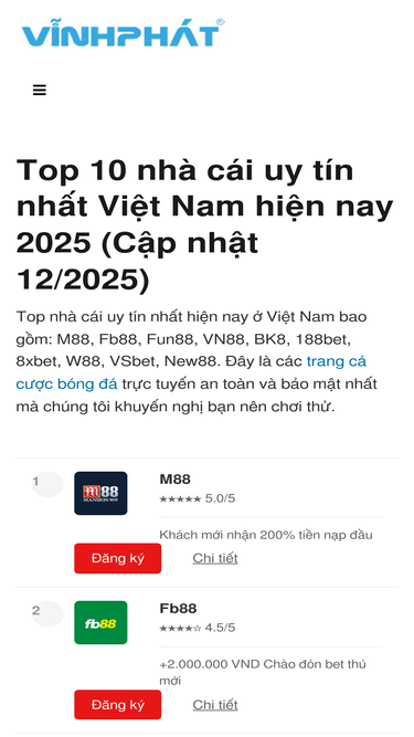 Top 10 nhà cái uy tín nhất Việt Nam hiện nay do Vĩnh Phát Mobile lựa chọn. Đây là các trang web nhà cái uy tính và hợp pháp mới nhất 2025.