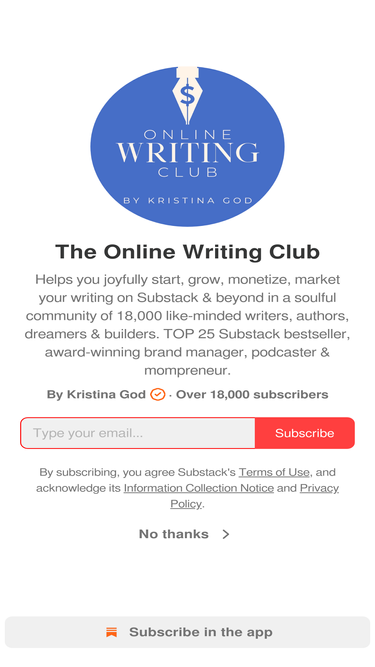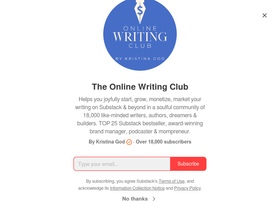 79%Helps you joyfully start, grow, monetize, market your writing on Substack & beyond in a soulful community of 15,000 like-minded writers, authors, dreamers & builders. TOP 25 #Education bestseller, award-winning brand manager, podcaster & mompreneur. Click to read The Online Writing Club, by Kristina God, a Substack publication with tens of thousands of subscribers.