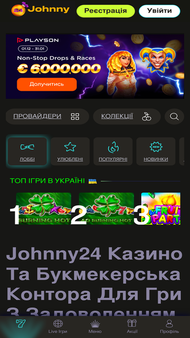 Приєднуйся до Джонни 24 та отримай щедрий бонус! Слоти, ставки й топові ігри онлайн. Швидка реєстрація та моментальні виплати!
