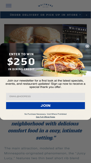 95%Whitmans Restaurant serves burgers and seasonal fare with a focus on fresh, local ingredients. Opened by native New Yorkers, the concept was born by friends whose vision was to provide the neighborhood with delicious comfort food in a cozy, intimate setting.