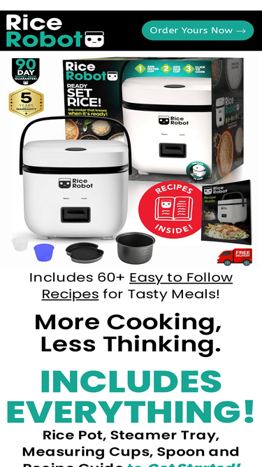 49%discover the rice robot - the ultimate solution for perfectly cooked rice every time. say goodbye to undercooked or overcooked rice with rice robot. enjoy hassle-free cooking, auto shut-off feature, and superior non-stick performance. cook more than just rice - try leftovers, couscous, stir-fry, soups, and more! try rice robot risk-free for 60 days. free shipping available. simplify your cooking with rice robot!