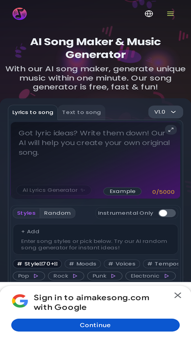 83%Free AI Music Generator. Create unlimited royalty-free songs instantly. Get 5 free credits daily for AI music generation, vocal removal, and lyrics creation.