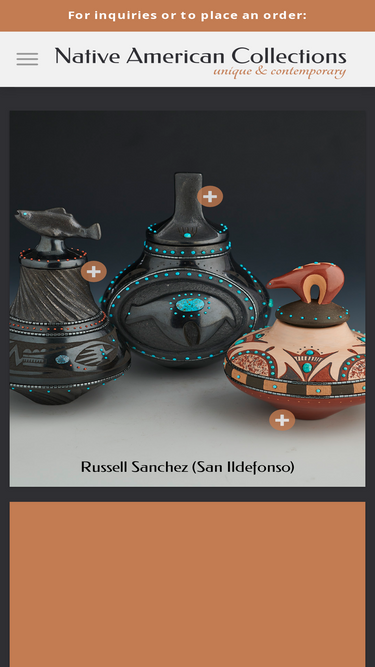 86%This is a highly polished jar by Russell Sanchez. The jar has a round shoulder and a short neck. There is a deeply carved medallion with a bear carved in relief. The bear is highly polished, as is the remainder of the jar. The center of the bear has a single inset piece of turquoise. Tiny coral insets surround it. Around the medallion is another row of coral insets, then two bands of hematite hei-shi beads, and another band of coral inset. There are a total of 120 stones inset throughout the entire piece. The lid has an inset coral and turquoise on the top. The jar was fired to a glassy, deep black, which creates a striking coloration with the deep red coral. Why coral? Russell says the red represents the Winter Clan at San Ildefonso and the turquoise the Summer Clan. The jar has a striking balance of design, form, and color. The jar and the lid are both signed on the bottom in the clay, "Russell". A wonderful traditional and yet very modern piece! 4.25"w x 6.5"h (w/ lid)