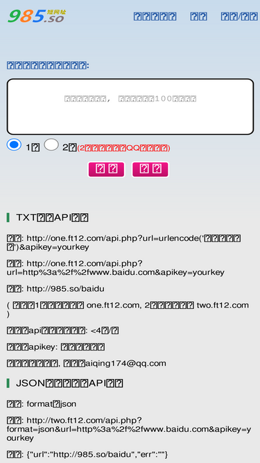 85%985.so为您提供: ,短网址程序,短网址服务,短网址转换,短网址api接口,批量生成短链接,短网址生成,压缩所有网址包括图片、flash、mp3、rar等所有互联网地址, 专业的网址缩短网站!。