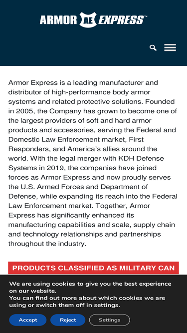 Armor Express designs, manufactures, and markets ballistic and stab/spike concealable, overt, and tactical body armor systems and accessories.