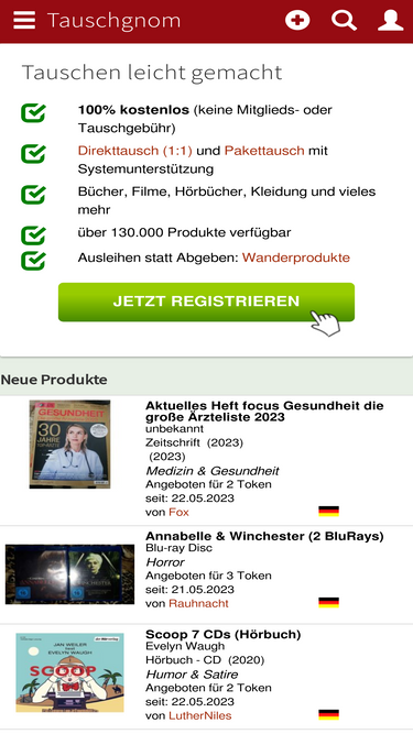 81%kostenlose tauschbörse! tauschen sie aus knapp 130.000 angeboten in über 700 kategorien -- aus bücher, kleidung, filme, hörbücher, selbstgemachtes, spielen, pflanzen, verschiedenes und musik.