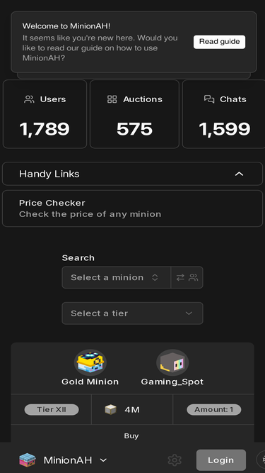 72%MinionAH is the best place to trade Hypixel SkyBlock minions. Minion auction house has a modern design, has QOL features for trading skyblock minions, and more.