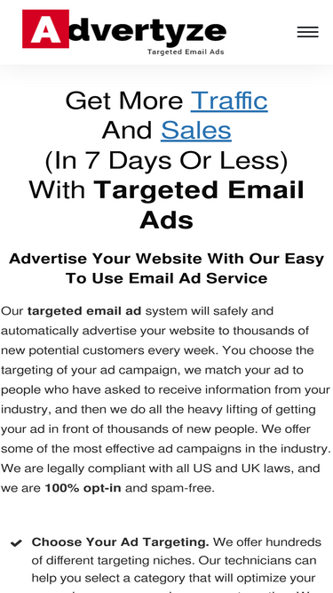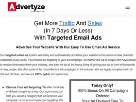 99%Our targeted email ads system will safely and automatically advertise your website. You choose the targeting of your email ads, we collect the targeted opt-in leads, and then we do all the mailing! We offer the best solo ads in the industry. Our email ad service is 100% opt-in and spam free.