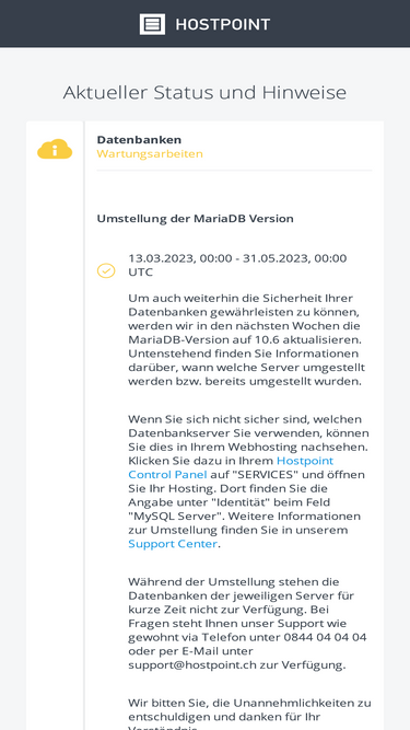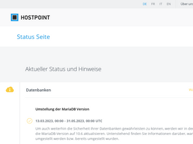 85%Auf unserer Status-Seite finden Sie Informationen über den aktuellen Betriebsstatus der Hostpoint-Services sowie Ankündigungen von geplanten Wartungsarbeiten.Auf unserer Status-Seite finden Sie Informationen über den aktuellen Betriebsstatus der Hostpoint-Services sowie Ankündigungen von geplanten Wartungsarbeiten.