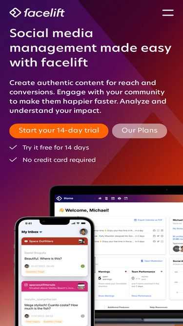 71%Sag Tschüss zu aufwändigem Social Media Management! Verwalte alle sozialen Kanäle mit facelift.