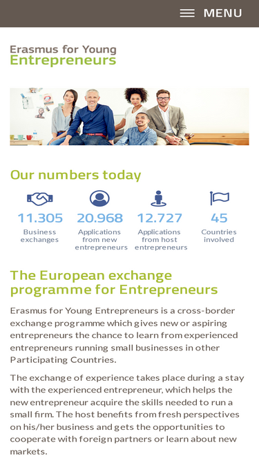 74%erasmus for young entrepreneurs is a business exchange programme, offering new entrepreneurs the possibility to work for up to 6 months with an experienced entrepreneur in his or her small or medium-sized business in another eu country. [ - europe]