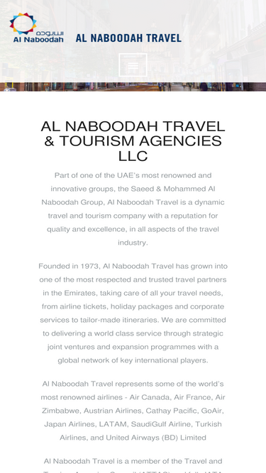 97%Part of one of the UAE’s most renowned and innovative groups, the Saeed & Mohammed Al Naboodah Group, Al Naboodah Travel is a dynamic travel and tourism company with a reputation for quality and excellence, in all aspects of the travel industry. Founded in 1973, Al Naboodah Travel has grown into one of the most respected and trusted travel partners in the Emirates, taking care of all your travel needs, from airline tickets, holiday packages and corporate services to tailor-made itineraries. We are committed to delivering a world class service through strategic joint ventures and expansion programmes with a global network of key international players. Al Naboodah Travel represents some of the world’s most renowned airlines - Air Canada, Air France, Air Zimbabwe, Austrian Airlines, Cathay Pacific, GoFirst, Japan Airlines, LATAM, SaudiGulf Airline, Turkish Airlines, and United Airways (BD) Limited Al Naboodah Travel is a member of the Travel and Tourism Agencies Council (ATTAC) and fully IATA accredited. A member of Dubai Travel and Tour Agents Group (DTTAG), Ras Al Khaimah Travel, Tourism and Cargo Agents Business Group (RAKTAG) and the American Society of Travel Agents (ASTA), the company is ISO certified.