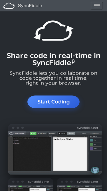 73%SyncFiddle is an online instant real-time HTML, CSS and JavaScript code editor to collaborate with developers in your browser. It's handy for remote pair programming, teaching, seminar, workshop, live stream, broadcast, troubleshooting, interview, and more...! Let's share their workspace with your teams and collaborate on code in real-time in SyncFiddle.