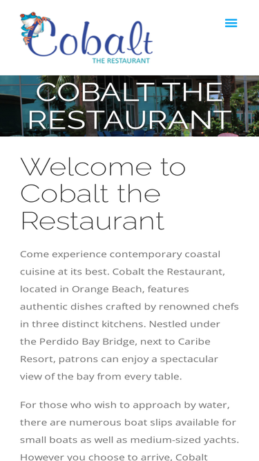 Contact Us Nestled under the Perdido Bay Bridge, next to Caribe Resort, Cobalt offers a casual and relaxing atmosphere with waterfront dining, live music and superior service. Hours Sunday - Thursday 11 a.m. to 9:30 p.m. Friday - Saturday 11 a.m. to 10:00 p.m Sunday Brunch 11 a.m. to 2:00 p.m