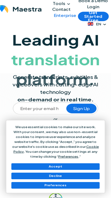 65%Maestra AIで世界中のオーディエンスを開拓しましょう:125以上の言語で、オンデマンドまたはリアルタイムで、超高速AI対応の文字起こし、字幕、そして多言語ナレーションを提供します。