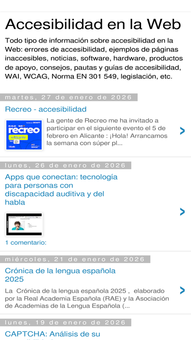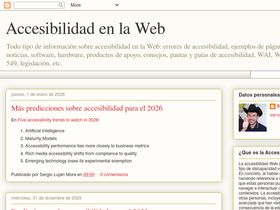 94%Todo tipo de información sobre accesibilidad en la Web: errores de accesibilidad, ejemplos de páginas inaccesibles, noticias, software, hardware, productos de apoyo, consejos, pautas y guías de accesibilidad, WAI, WCAG, Norma EN 301 549, legislación, etc.