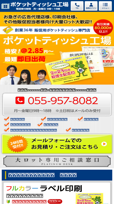 62%販促用ポケットティッシュならポケットティッシュ工場にお任せ。お急ぎの広告代理店様、印刷会社様、販促用のポケットティッシュを格安で製作・製造販売を行っております。無地もチラシラベル入りも小ロットから大量ロットまで大歓迎。お見積り・ご注文は24時間受け付けております。