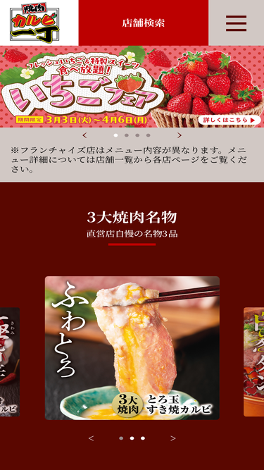 100%厳選したお肉を仕入れ、こだわりを持って提供するワンランク上の焼肉食べ放題「カルビ一丁」。三大焼肉「とろ玉すき焼きカルビ」「白ネギ一丁タン」「旨辛壺漬けドラゴンカルビ」や牛タン・塊肉などの厳選肉をお楽しみください。