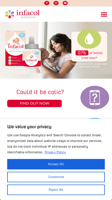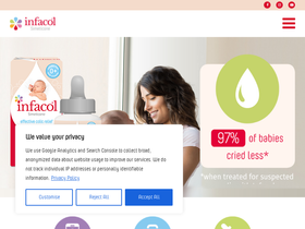 68%This is the offical site for Infacol Colic Relief Drops. Infacol is a baby colic treatment that helps to bring up wind or air trapped in your baby's tummy and can relieve griping pain. Infacol can be used from birth onwards, has a natural orange flavour, is sugar, alcohol and colourant free and comes with a convenient integrated dropper – making it easy to give to your baby. Each bottle contains enough liquid for up to 100 doses.