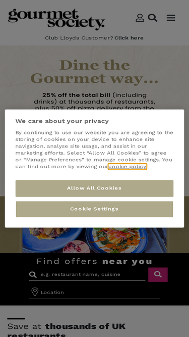 become a gourmet society member and start eating out for less today! enjoy 2-4-1, 50% off food, or 25% off your whole bill at restaurants across the uk.
