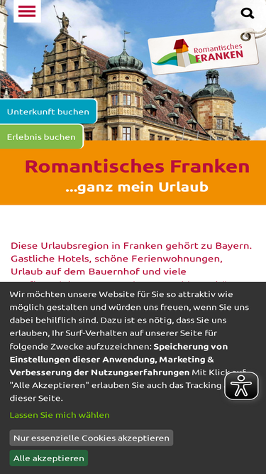 81%diese urlaubsregion in franken gehört zu bayern. der tourismusverband romantisches franken informiert über städte, sehenswertes, hotels, ferienwohnungen, radtouren, wanderwege, ausflugstipps, familienurlaub und mehr. hier finden sie ausflugstipps, theater und festspiele, urlaub auf dem bauernhof, den jakobsweg, rothenburg ob der tauber, dinkelsbühl, die cadolzburg, schlösser und burgen, hotels und ferienwohnungen in der region. die romantische strasse, der limes und die burgenstraße führen hindurch. auch der playmobil-funpark, das kriminalmuseum, das limeseum und das freilandmuseum in bad windsheim sind sehenswerte überregionale highlights. ein großes netz an radrouten und die vielen wanderwege vor allem im naturpark frankenhöhe laden zum natur genießen ein.