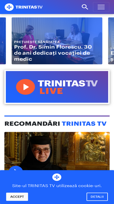 68%Prin intermediul TRINITAS TV, o televiziune cultural-religioasa, Patriarhia Română informează opinia publică despre evenimentele bisericeşti, lucrarea pastoral-misionară, socială, educaţională şi culturală a Bisericii, aducând în atenţia publicului istoria, cultura şi tezaurul de credinţă şi spiritualitate creştină românească în context european.