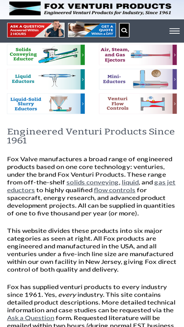 fox manufactures a range of engineered venturi products from solids conveying, liquid, and gas jet eductors to flow controls for spacecraft, r&d, and industry.