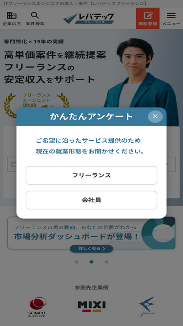 86%フリーランスITエンジニア向け案件・求人サイト|業界最大級の案件掲載実績があるフリーエンジニアのIT案件・求人サイト「ココナラテック」なら、初心者でもスキルアップできる案件から収入アップを狙える高単価案件まで多数あります。