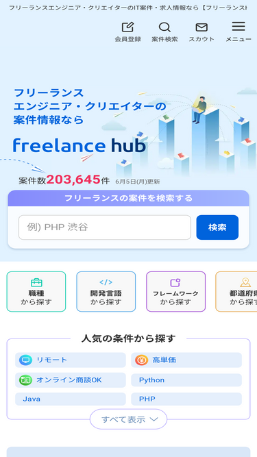 93%【フリーランスhub】はフリーランスエンジニア・クリエイター向けのit案件・求人情報をまとめて検索できます。案件・求人検索やエージェント情報、フリーランスエンジニア・クリエイター向けのお役立ち記事であなたのの仕事探しをサポートします。