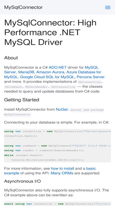 68%MySqlConnector is a high-performance, asynchronous C# ADO.NET driver for MySQL Server, MariaDB, Amazon Aurora, Azure Database for MySQL, Google Cloud SQL for MySQL, Percona Server and more.