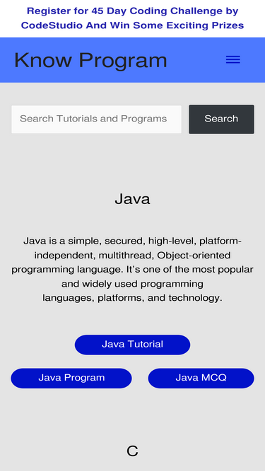 96%Know Program | Learn to Code for Free. Java Tutorial, Program, and Quiz, C Tutorial, Program, and Quiz. Learn Oracle database, JDBC.