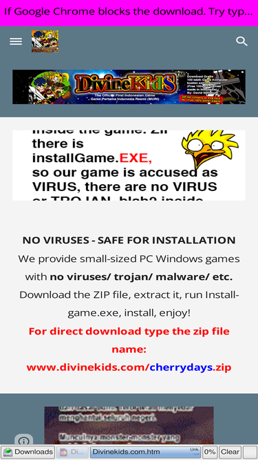 74%NO VIRUSES - SAFE FOR INSTALLATION We provide small-sized PC Windows games with no viruses/ trojan/ malware/ etc. Download the ZIP file, extract it, run Install-game.exe, install, enjoy!For direct download type the zip file name: www.divinekids.com/cherrydays.zip