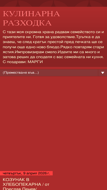 100%с тази моя скромна храна радвам семейството си и приятелите ни. готвя за удоволствие.тръпка е да знаеш, че след кратък престой пред печката ще се получи още едно ново блюдо.рядко повтарям стари ястия.импровизирам смело.идеите ми са много и затова реших да споделя с вас семейната ни кухня. с поздрави: марги