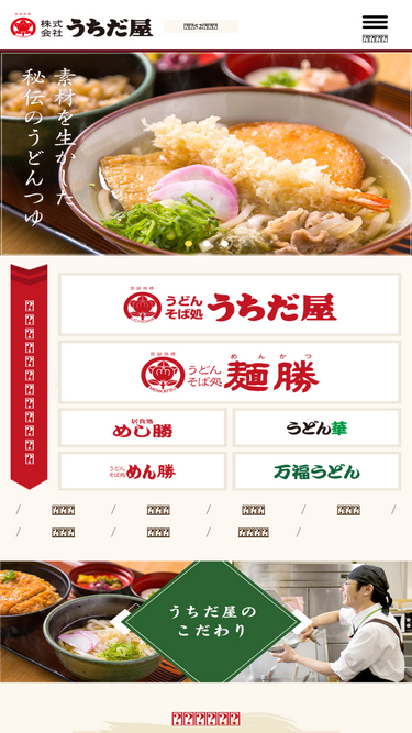 77%株式会社うちだ屋のホームページです。うどんレストラン「うちだ屋」をはじめ「麺勝」「めし勝」「万福うどん」「うどん華」セルフ店舗の「めん勝」など九州一円に店舗展開をしています。