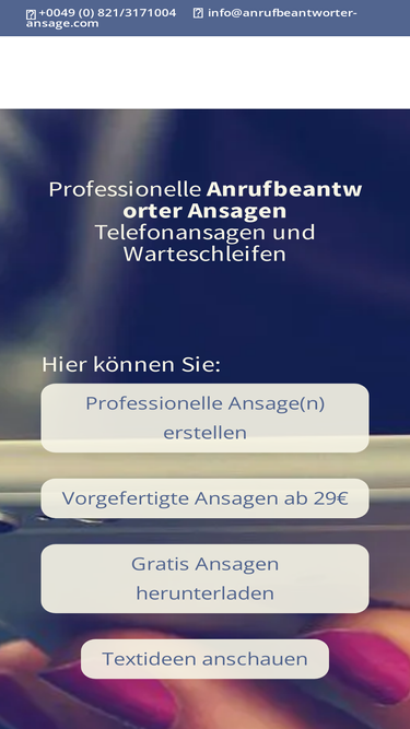 100%Willkommen bei Anrufbeantworter-Ansage.com Ihrem Anbieter für professionelle Telefonansagen - Wir sorgen für den perfekten Telefon Auftritt Ihrer Firma.