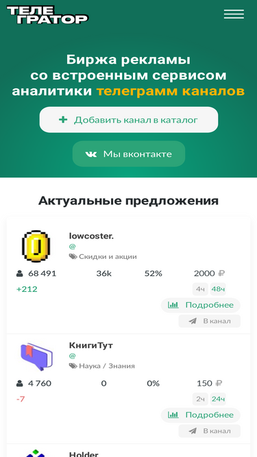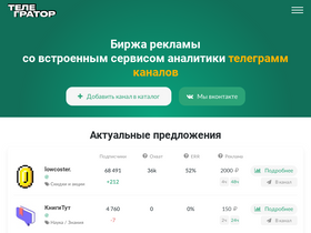 79%телегратор.ру – сервис нативных интеграций в телеграм каналах и чатах. найдите лучшие каналы для размещения рекламы. аналитика, сортировка по категориям и количеству подписчиков. оптимальные предложения для монетизации вашего канала.