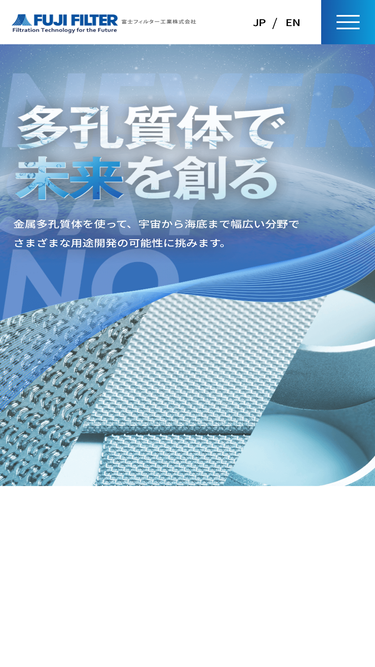 100%富士フィルター工業は、高精度産業用フィルターと、フィルターシステムの開発・設計・製造・販売を一貫して行うフィルターの総合エンジニアリング会社です。特にステンレススチールをはじめとする金網を積層し焼結したフジプレート(焼結金属メッシュフィルター)と、フジメタルファイバー(焼結金属不織布フィルター)、フジロイ(焼結金属ワインドフィルター)、フジフロ(空気流動用金属多孔質体)、その他非金属フィルターとしてユニークな特徴を持つフジボン(プリーツペーパー・ワインドフィルター)は富士フィルターの代表的なフィルターエレメントと言えます。