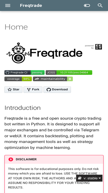 79%freqtrade is a free and open source crypto trading bot written in python, designed to support all major exchanges and be controlled via telegram or builtin web ui