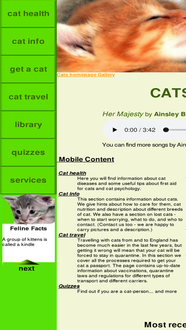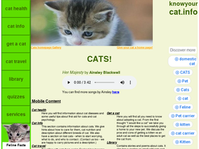 83%know your cat (knowyourcat) site contains all the information you need as a cat owner from the basics of how and where to get a cat through to the cat maintenance and health problems and information about traveling with cats. knowyourcat also has extensive library of cat poems and funny stories. the site offers information about lost cats and provides free home pages for your favorite cat