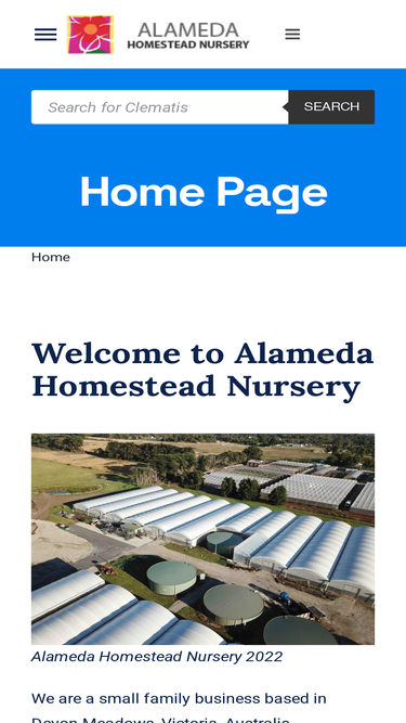 74%Welcome to Alameda Homestead Nursery We’re a family-run nursery based in Devon Meadows, Victoria, Australia, specialising in Clematis and other garden-worthy plants. The nursery was originally established in 1991 by Judy and David Button in Berwick, and after 25 wonderful years there, we relocated to our current home