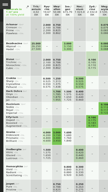 93%Cerlestes' Ore Table is a daily updated, highly informative and easy-to-read source of information about mining in the EVE Online universe.
