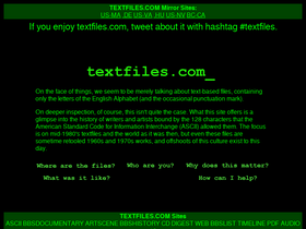 According to Similarweb data of monthly visits, textfiles.com’s top competitor in November 2025 is bbsdocumentary.com with 3.2K visits. textfiles.com 2nd most similar site is archives.thebbs.org, with -- visits in November 2025, and closing off the top 3 is milw0rm.com with --.