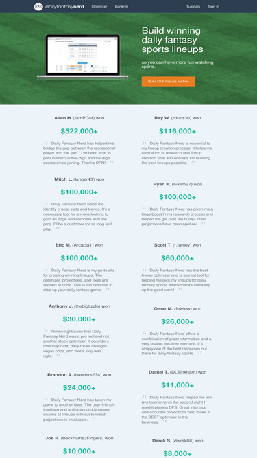 88%Generate optimal NFL, NBA, MLB, and NHL lineups for DraftKings, FanDuel, and Yahoo with our daily fantasy lineup optimizer and projections tool.