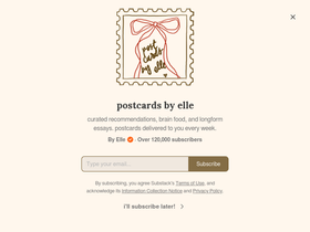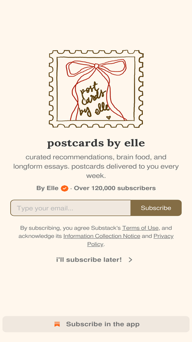 73%weekly newsletters from the archive of things i love (books, articles, art, essays, movies, lists) ♡. click to read postcards by elle, a substack publication with thousands of subscribers.