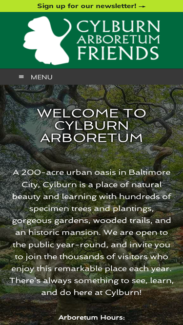 80%Cylburn Arboretum Friends 4915 Greenspring Ave.Baltimore, MD 21209Phone: 410-367-2217info@cylburn.org Our offices are located on the 2nd floor of the mansion, which is not open to the public. Please call or send us an email and the appropriate staff will get back to you. Sign up for our newsletter to get the latest news and events.