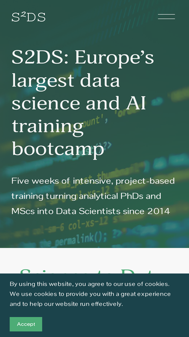 79%Science to Data Science (S2DS) is a data science bootcamp providing real business experience. Transition from academia to industry and become a data scientist today.