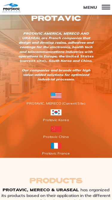 77%PROTAVIC AMERICA, MERECO AND URASEAL are French companies that design and develop resins, adhesives and coatings for the electronics, health tech and telecommunications industries with operations in Europe, the United States (current site), South Korea and China. Our companies and brands offer high value-added solutions for optimized industrial processes.