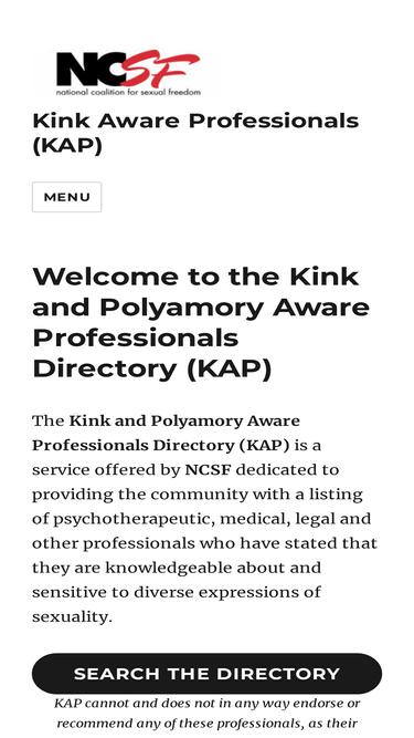 100%The Kink and Polyamory Aware Professionals Directory (KAP) is a service offered by NCSF dedicated to providing the community with a listing of psychotherapeutic, medical, legal and other professionals who have stated that they are knowledgeable about and sensitive to diverse expressions of sexuality. KAP cannot and does not in any way endorse or recommend … Continue reading "Welcome to the Kink and Polyamory Aware Professionals Directory (KAP)"