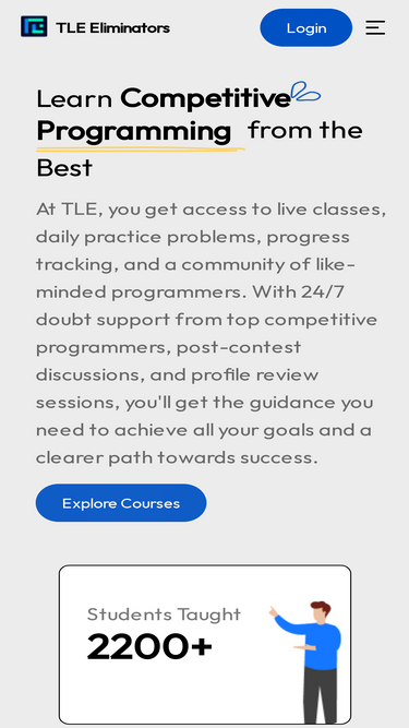 77%TLE Eliminators is the best place to learn competitive programming (CP), data structures, and algorithms (DSA) with CP-31 sheet and the most popular courses trusted by 10,000+ coders. Our courses are for students looking to get placements and internships at tech companies and those interested in increasing their ratings on platforms like Codeforces, Codechef, Atcoder and doing well in competitions like ICPC. Whether you're a beginner or an advanced coder, get everything you need to kickstart your CP journey with TLE Eliminators! 🚀