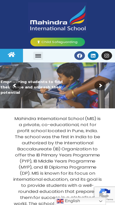 85%Mahindra International School Learning and growing together New Admission Prospectus Mahindra International School (MIS) is a private, co-educational, not for profit school located in Pune, India. The school was the first in India to be authorized by the International Baccalaureate (IB) Organization to offer the IB Primary Years Programme (PYP), IB Middle Years Programme (MYP),
